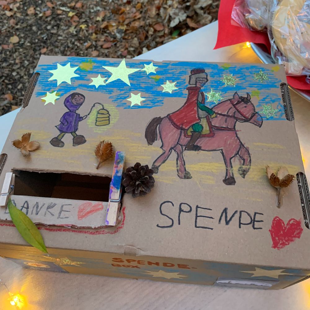 En la foto se ve una caja para donativos (Spende) que dibujaron los niños junto con las educadoras.