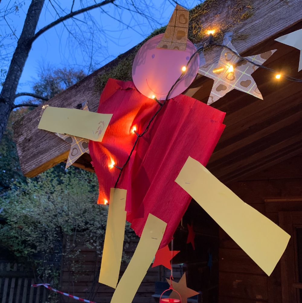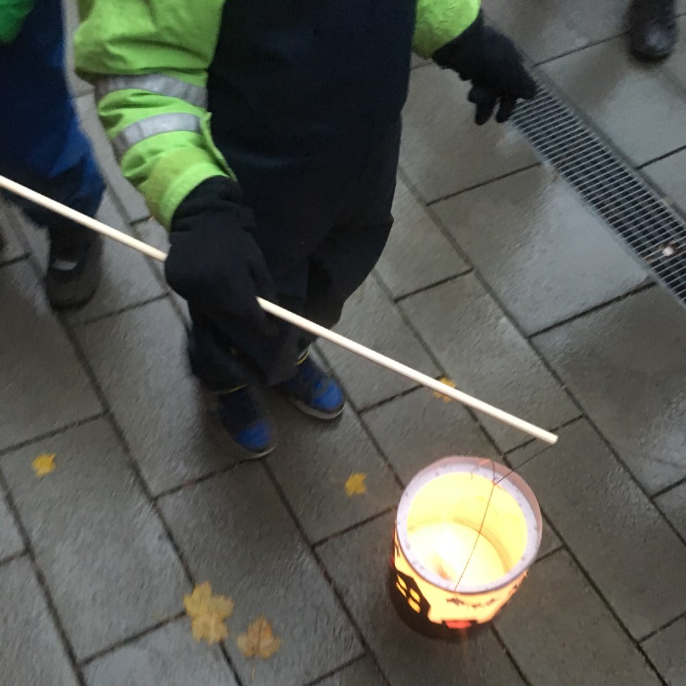 El 11/11 ya se oscurece más temprano en Alemania. Este año el sol se pone a las 16:40. Cada día se va oscureciendo más temprano. Así es que linternas de colores con una velita dentro iluminan las calles. Originalmente los niños crean las linternas en el jardín de niños o en casa, con dibujos o recortando figuras en cartulina oscura y pegando papel de colores y traslucido por dentro.